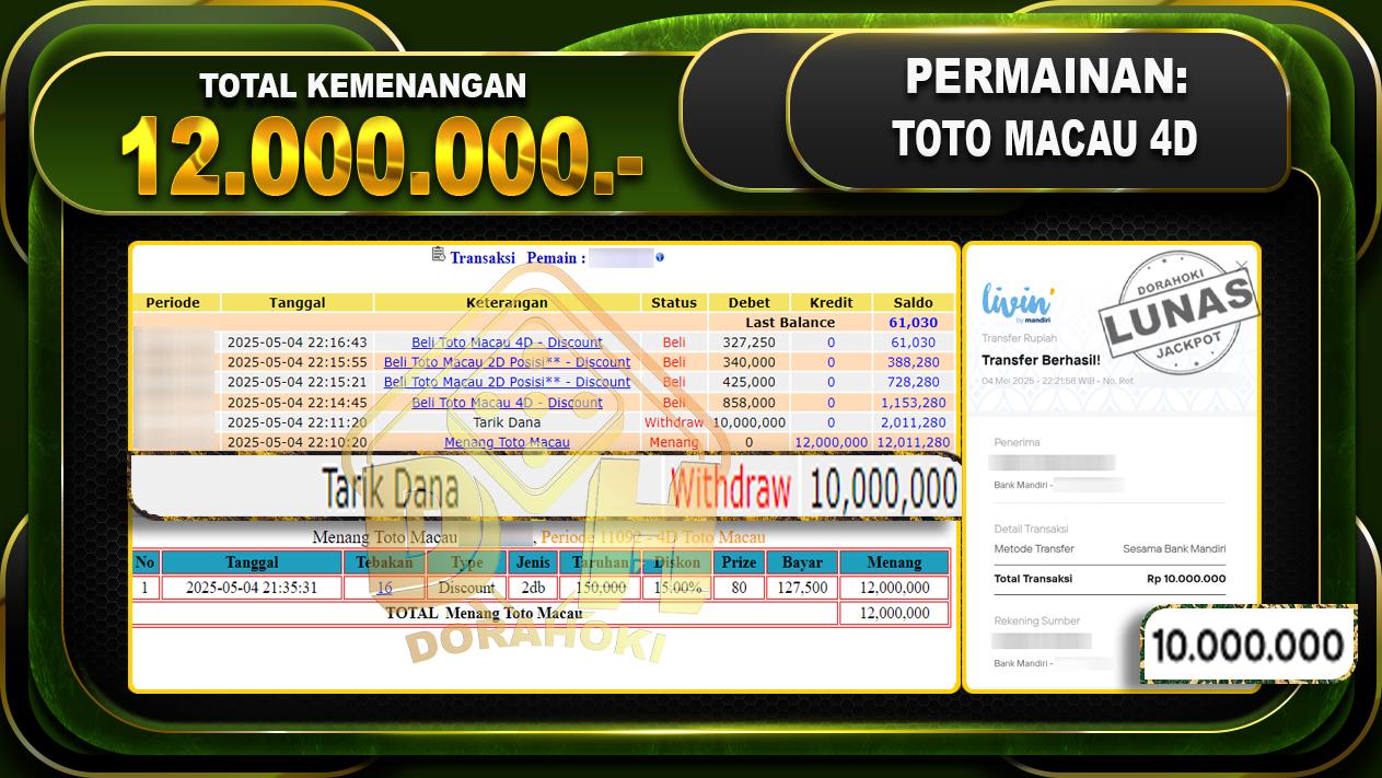 Bukti JP TOGEL TOTO MACAU 4D – ucapkan selamat kepada user id Omaxxx atas kemenangan di TOGEL TOTO MACAU 4D dengan total kemenangan Rp.12.000.000.,- . Yang pasti nya langsung LUNAS sesuai bukti ya bosku. Dorahoki nih bosku berapapun akan tetap kami bayar lunas ya bosku.