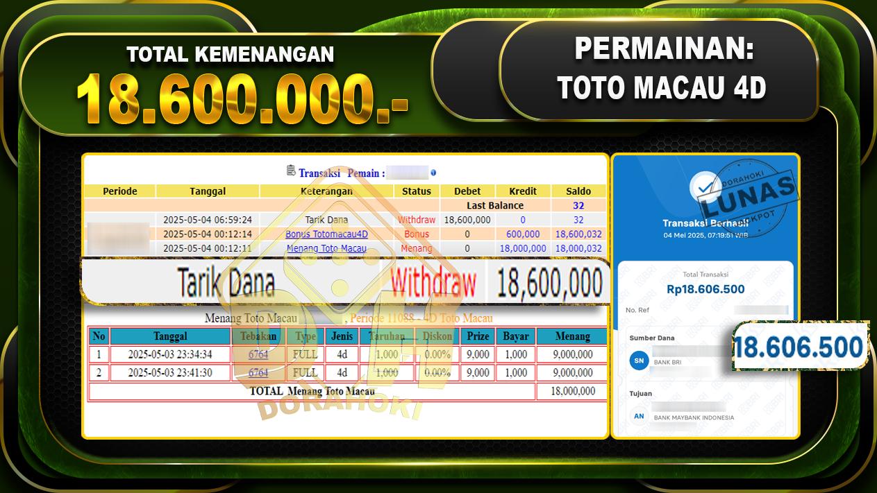 Bukti JP TOGEL TOTO MACAU 4D – ucapkan selamat kepada user id Andxxx atas kemenangan di TOGEL TOTO MACAU 4D dengan total kemenangan Rp.18.600.000 .,- . Yang pasti nya langsung LUNAS sesuai bukti ya bosku. Dorahoki nih bosku berapapun akan tetap kami bayar lunas ya bosku.