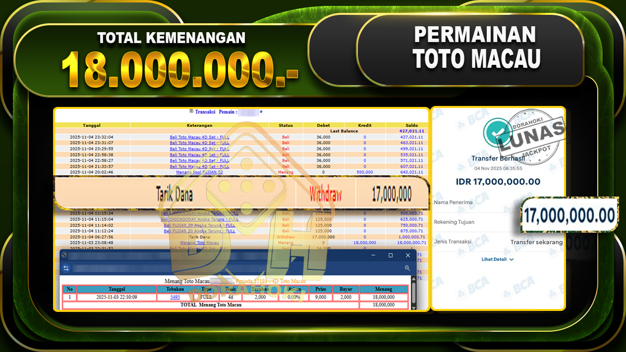 Bukti JP TOGEL TOTO MACAU 4D – ucapkan selamat kepada user id ahoxxxxx atas kemenangan di TOGEL TOTO MACAU 4D dengan total kemenangan Rp.18,000,000,- Yang pasti nya langsung LUNAS sesuai bukti ya bosku. Dorahoki nih bosku berapapun akan tetap kami bayar lunas ya bosku