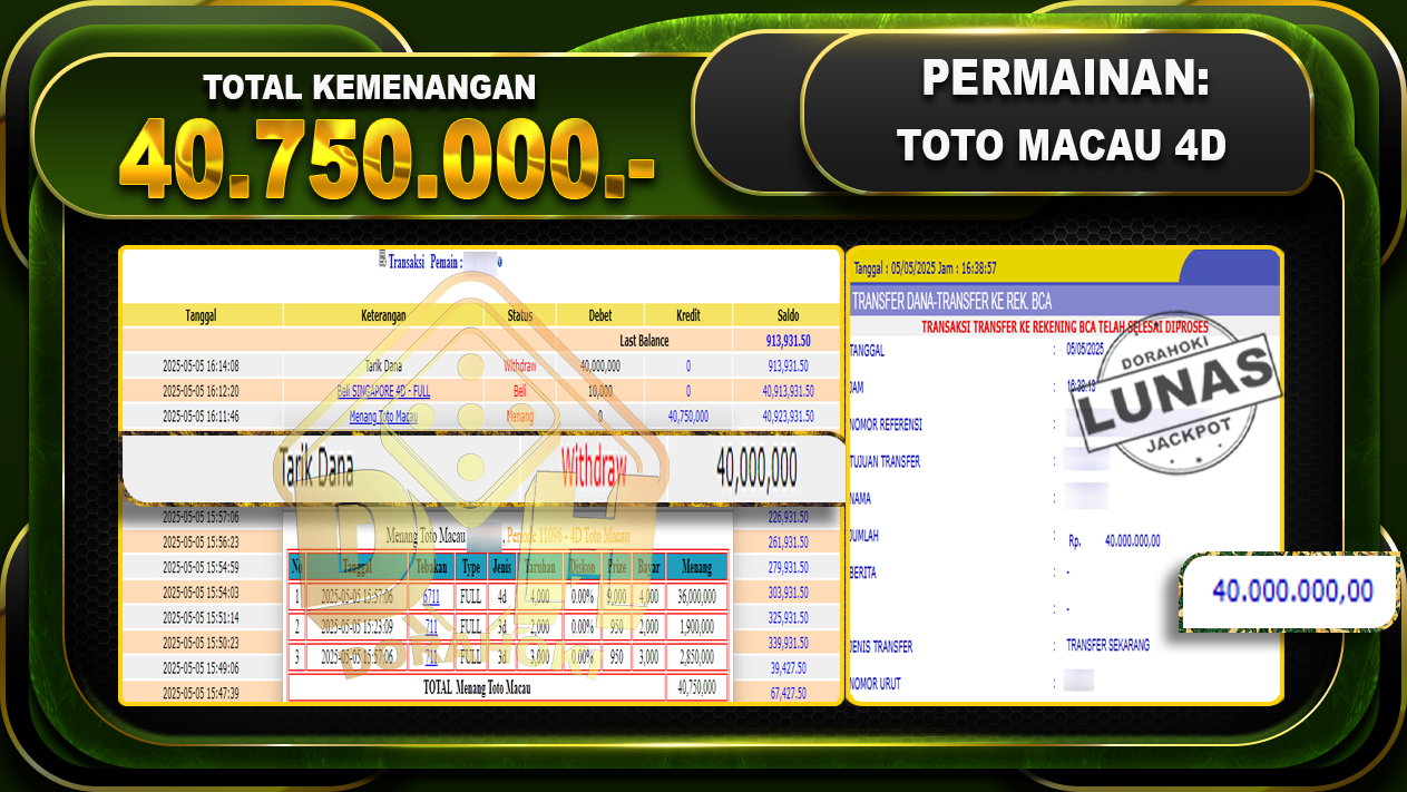 Bukti JP TOGEL TOTO MACAU 4D – ucapkan selamat kepada user id Gabxxx atas kemenangan di TOGEL TOTO MACAU 4D dengan total kemenangan Rp.40.750.000.,- . Yang pasti nya langsung LUNAS sesuai bukti ya bosku. Dorahoki nih bosku berapapun akan tetap kami bayar lunas ya bosku.