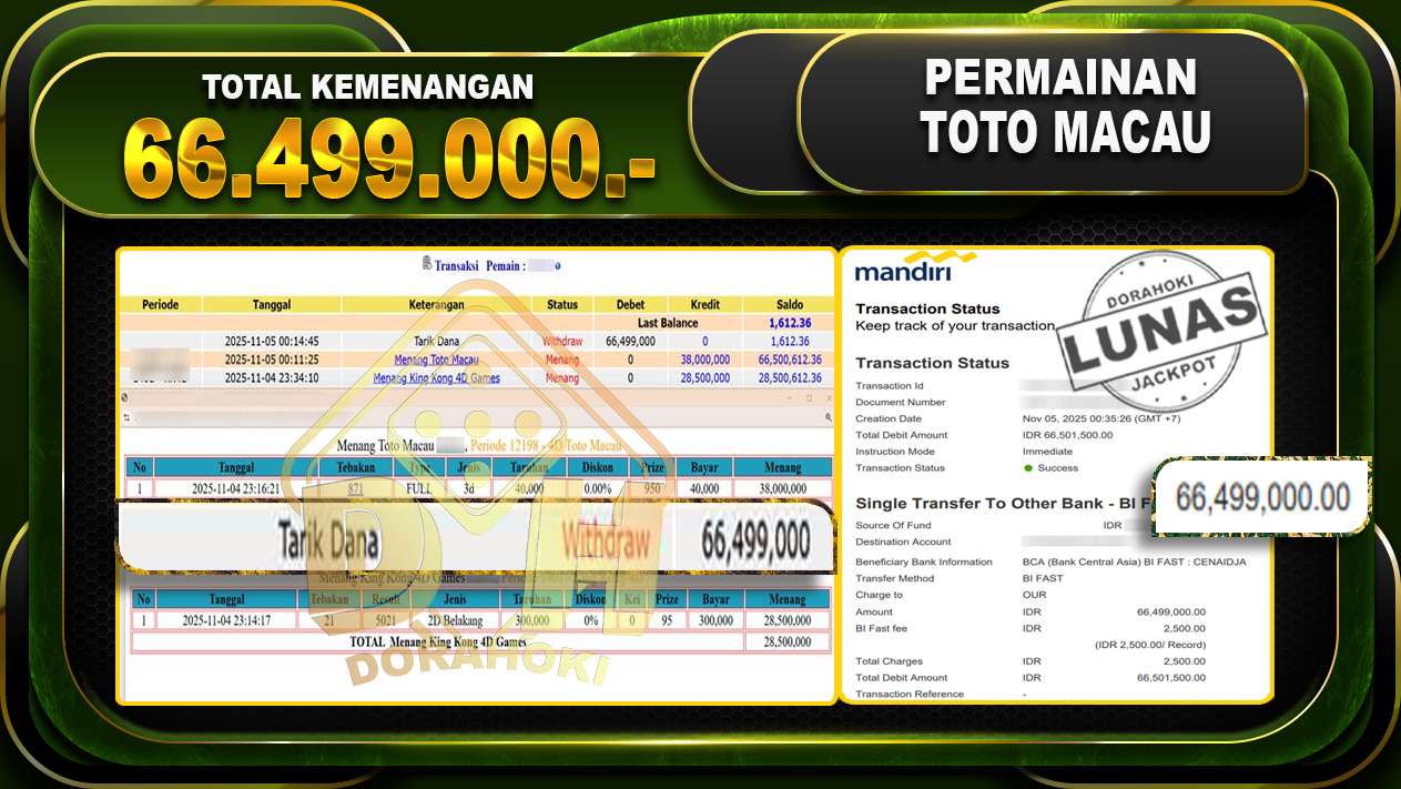 Bukti JP TOGEL TOTO MACAU 4D – ucapkan selamat kepada user id busxx atas kemenangan di TOGEL TOTO MACAU 4D dengan total kemenangan Rp.66,499,000,- Yang pasti nya langsung LUNAS sesuai bukti ya bosku. Dorahoki nih bosku berapapun akan tetap kami bayar lunas ya bosku