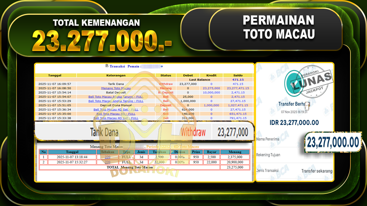 Bukti JP TOGEL TOTO MACAU 4D – ucapkan selamat kepada user id invxxxxx atas kemenangan di TOGEL TOTO MACAU 4D dengan total kemenangan Rp.23,277,000,- Yang pasti nya langsung LUNAS sesuai bukti ya bosku. Dorahoki nih bosku berapapun akan tetap kami bayar lunas ya bosku