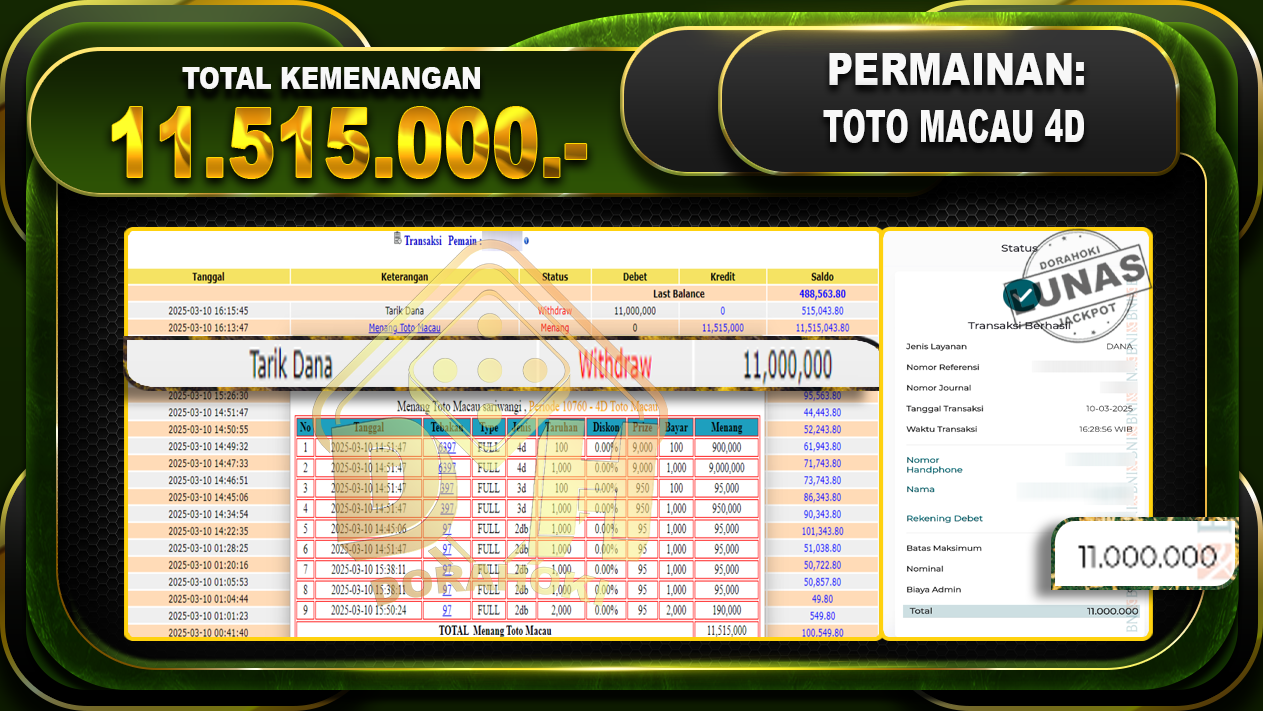 Bukti JP TOGEL TOTO MACAU 4D – ucapkan selamat kepada user id Sarxxx atas kemenangan di TOGEL TOTO MACAU 4D dengan total kemenangan Rp.11.515.000,- . Yang pasti nya langsung LUNAS sesuai bukti ya bosku. Dorahoki nih bosku berapapun akan tetap kami bayar lunas ya bosku.