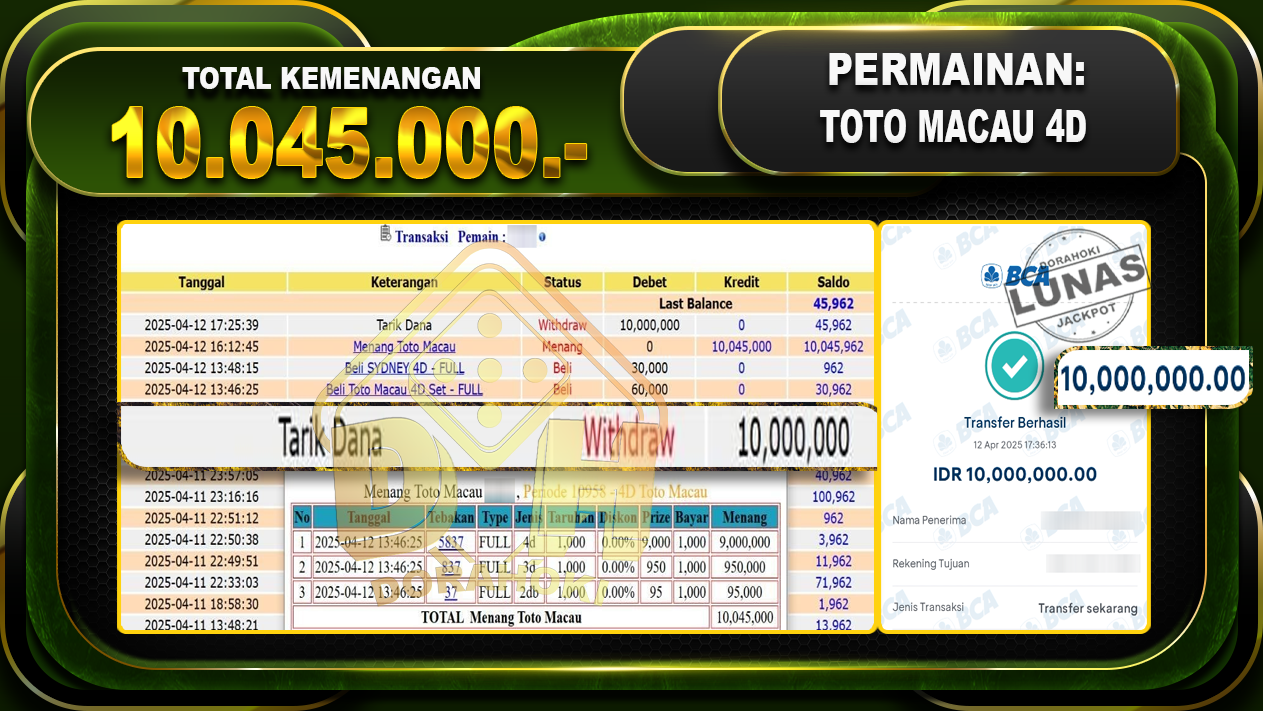 Bukti JP TOGEL TOTO MACAU 4D – ucapkan selamat kepada user id Arsxxx atas kemenangan di TOGEL TOTO MACAU 4D dengan total kemenangan Rp.10.045.000,- . Yang pasti nya langsung LUNAS sesuai bukti ya bosku. Dorahoki nih bosku berapapun akan tetap kami bayar lunas ya bosku.