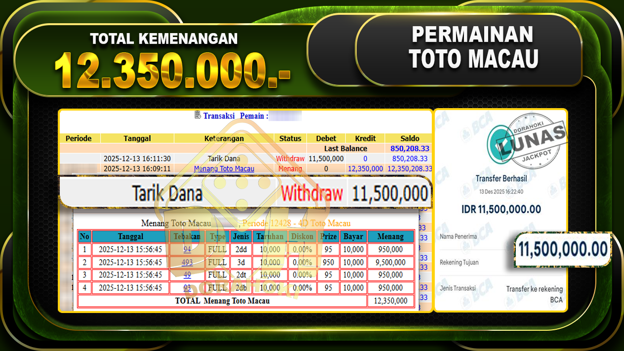Bukti JP TOGEL TOTO MACAU 4D – ucapkan selamat kepada user id harxxx atas kemenangan di TOGEL TOTO MACAU 4D dengan total kemenangan Rp.12,350,000,- Yang pasti nya langsung LUNAS sesuai bukti ya bosku. Dorahoki nih bosku berapapun akan tetap kami bayar lunas ya bosku