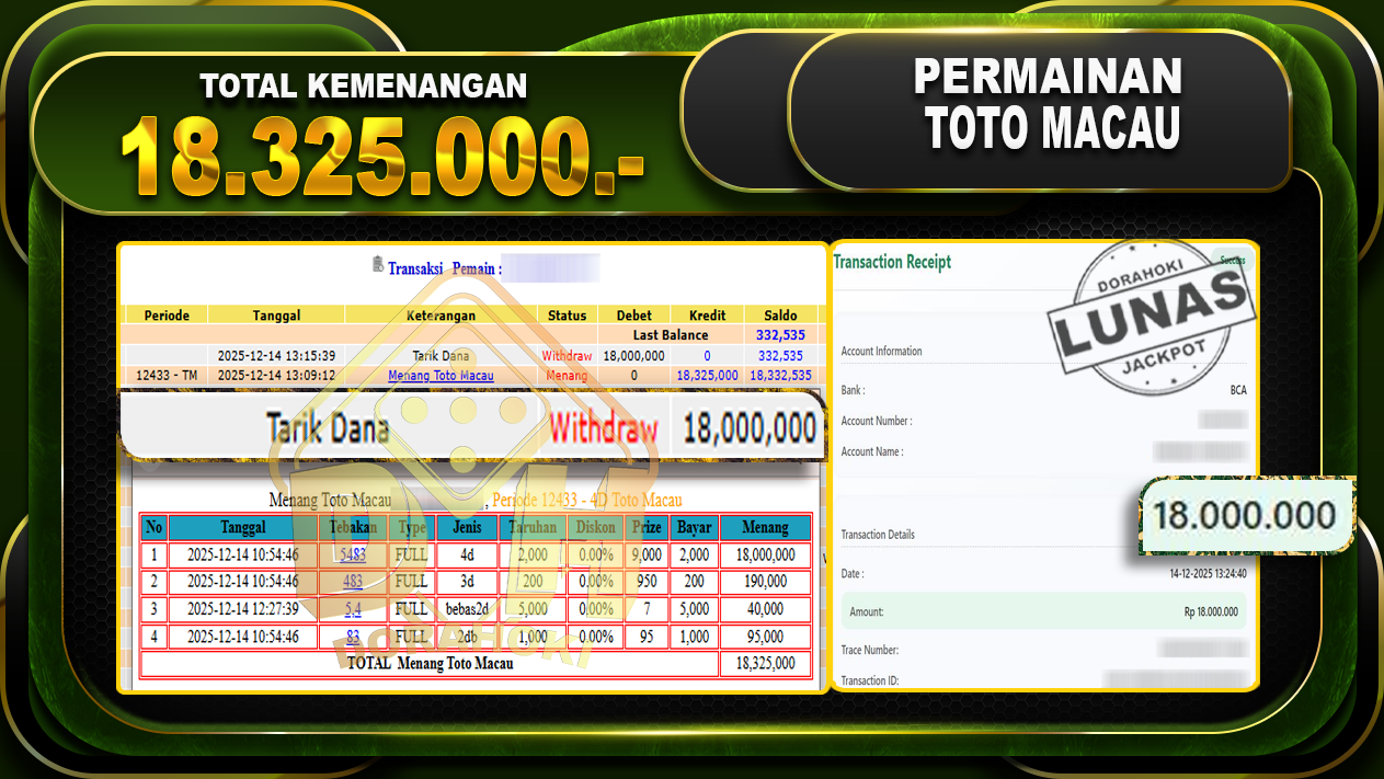 Bukti JP TOGEL TOTO MACAU 4D – ucapkan selamat kepada user id hayxxxxx atas kemenangan di  TOGEL TOTO MACAU 4D dengan total kemenangan Rp.18,325,000,- Yang pasti nya langsung LUNAS sesuai bukti ya bosku. Dorahoki nih bosku berapapun akan tetap kami bayar lunas ya bosku