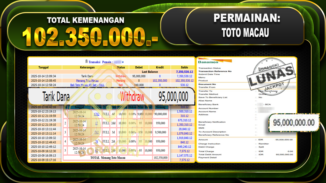Bukti JP TOGEL TOTO MACAU 4D – ucapkan selamat kepada user id harxxxx atas kemenangan di TOGEL TOTO MACAU 4D dengan total kemenangan Rp.102,350,000,- Yang pasti nya langsung LUNAS sesuai bukti ya bosku. Dorahoki nih bosku berapapun akan tetap kami bayar lunas ya bosku
