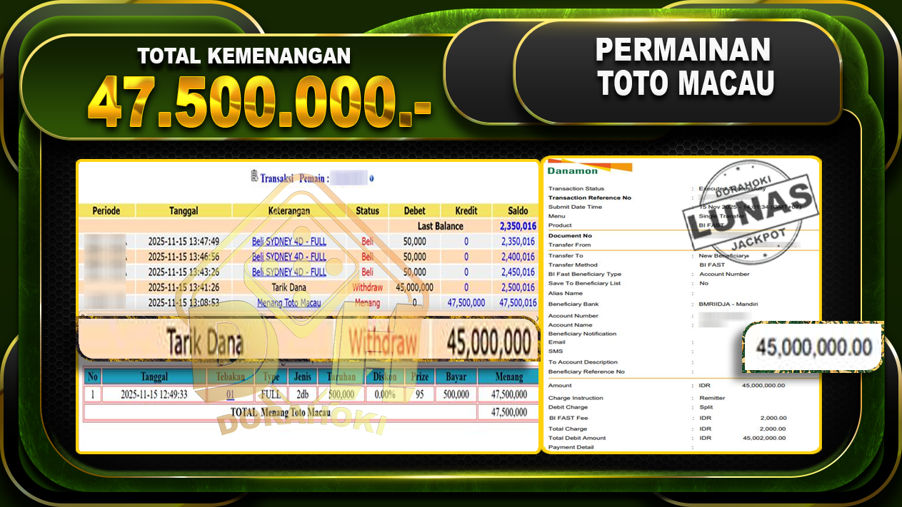 Bukti JP TOGEL TOTO MACAU 4D – ucapkan selamat kepada user id lenxxxxx atas kemenangan di TOGEL TOTO MACAU 4D dengan total kemenangan Rp.47,500,000,- Yang pasti nya langsung LUNAS sesuai bukti ya bosku. Dorahoki nih bosku berapapun akan tetap kami bayar lunas ya bosku
