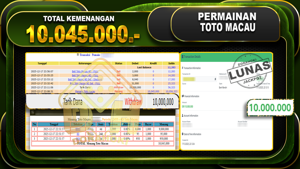 Bukti JP TOGEL TOTO MACAU 4D – ucapkan selamat kepada user id jemxxxx atas kemenangan di TOGEL TOTO MACAU 4D dengan total kemenangan Rp.10,045,000,- Yang pasti nya langsung LUNAS sesuai bukti ya bosku. Dorahoki nih bosku berapapun akan tetap kami bayar lunas ya bosku