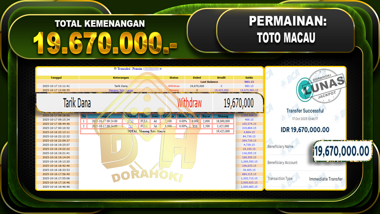 Bukti JP TOGEL TOTO MACAU 4D – ucapkan selamat kepada user id invxxxxxx atas kemenangan di TOGEL TOTO MACAU 4D dengan total kemenangan Rp.19,670,000,- Yang pasti nya langsung LUNAS sesuai bukti ya bosku. Dorahoki nih bosku berapapun akan tetap kami bayar lunas ya bosku