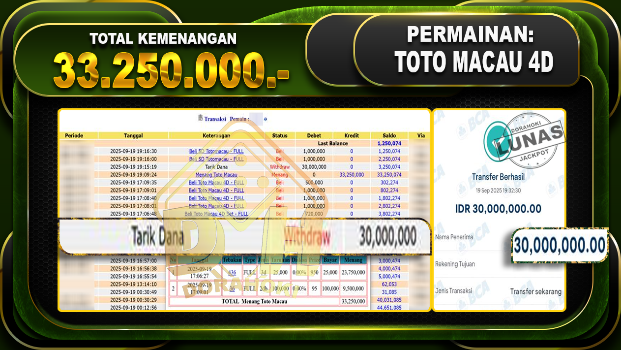 Bukti JP TOGEL TOTO MACAU 4D – ucapkan selamat kepada user id Busxx atas kemenangan di TOGEL TOTO MACAU 4D dengan total kemenangan Rp.33,250,000,- Yang pasti nya langsung LUNAS sesuai bukti ya bosku. Dorahoki nih bosku berapapun akan tetap kami bayar lunas ya bosku