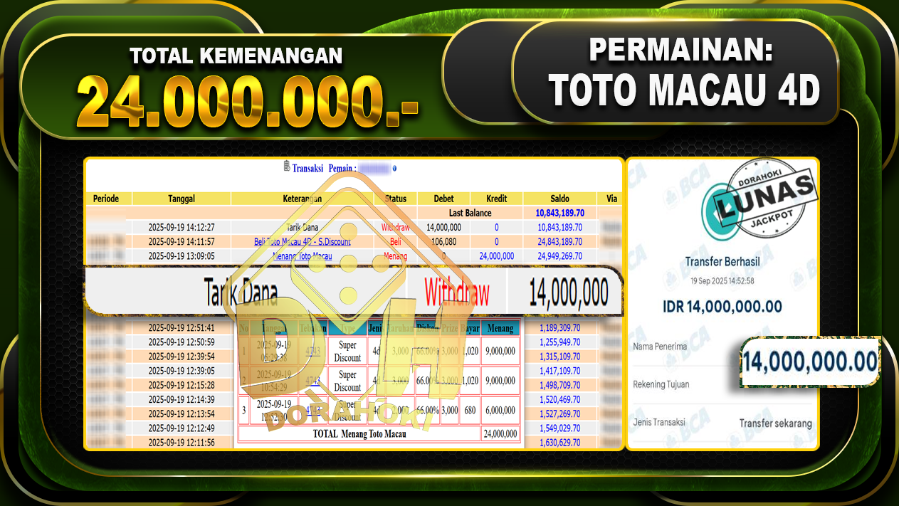 Bukti JP TOGEL TOTO MACAU 4D – ucapkan selamat kepada user id Mimxxxxxx atas kemenangan di TOGEL TOTO MACAU 4D dengan total kemenangan Rp.24,000,000,- Yang pasti nya langsung LUNAS sesuai bukti ya bosku. Dorahoki nih bosku berapapun akan tetap kami bayar lunas ya bosku