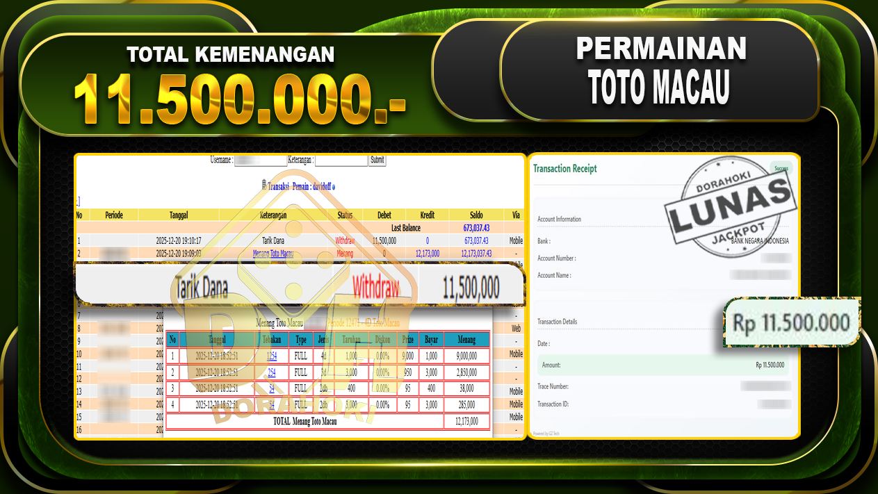 Bukti JP TOGEL TOTO MACAU 4D – ucapkan selamat kepada user id davxxxxx atas kemenangan di TOGEL TOTO MACAU 4D dengan total kemenangan Rp.11.500.000,- Yang pasti nya langsung LUNAS sesuai bukti ya bosku. Dorahoki nih bosku berapapun akan tetap kami bayar lunas ya bosku