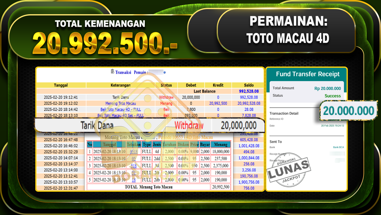 Bukti JP TOGEL TOTO MACAU 4D – ucapkan selamat kepada user id capoxxx atas kemenangan di TOGEL TOTO MACAU 4D dengan total kemenangan Rp.20.992.500,- . Yang pasti nya langsung LUNAS sesuai bukti ya bosku. Dorahoki nih bosku berapapun akan tetap kami bayar lunas ya bosku.