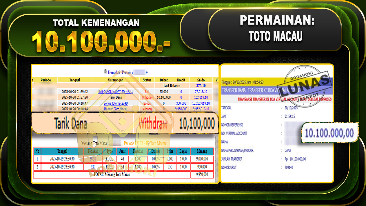 Bukti JP TOGEL TOTO MACAU 4D – ucapkan selamat kepada user id chaxxxx atas kemenangan di TOGEL TOTO MACAU 4D dengan total kemenangan Rp.10,100,000,- Yang pasti nya langsung LUNAS sesuai bukti ya bosku. Dorahoki nih bosku berapapun akan tetap kami bayar lunas ya bosku