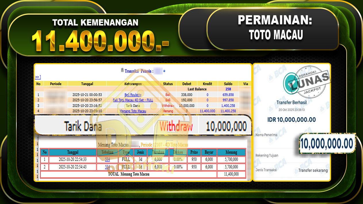 Bukti JP TOGEL TOTO MACAU 4D – ucapkan selamat kepada user id labxxxx atas kemenangan di TOGEL TOTO MACAU 4D dengan total kemenangan Rp.11,400,000,- Yang pasti nya langsung LUNAS sesuai bukti ya bosku. Dorahoki nih bosku berapapun akan tetap kami bayar lunas ya bosku