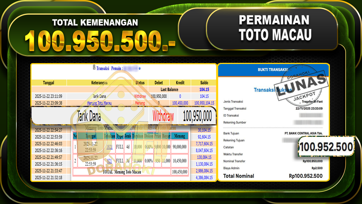 Bukti JP TOGEL TOTO MACAU 4D – ucapkan selamat kepada user id invxxxxx atas kemenangan di  TOGEL TOTO MACAU 4D dengan total kemenangan Rp.100,950,500,- Yang pasti nya langsung LUNAS sesuai bukti ya bosku. Dorahoki nih bosku berapapun akan tetap kami bayar lunas ya bosku