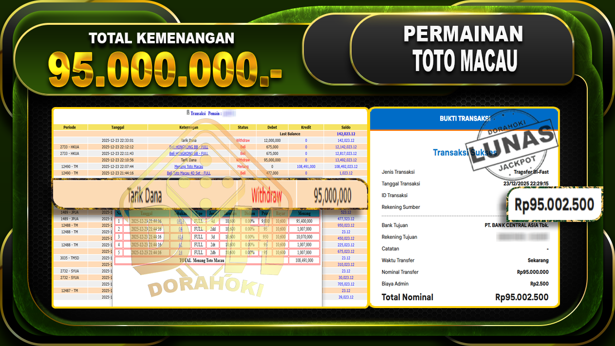 Bukti JP TOGEL TOTO MACAU 4D – ucapkan selamat kepada user id yatxxxxx atas kemenangan di TOGEL TOTO MACAU 4D dengan total kemenangan Rp.95.000.000,- Yang pasti nya langsung LUNAS sesuai bukti ya bosku. Dorahoki nih bosku berapapun akan tetap kami bayar lunas ya bosku