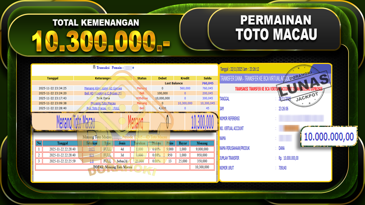 Bukti JP TOGEL TOTO MACAU 4D – ucapkan selamat kepada user id asrxxx atas kemenangan di TOGEL TOTO MACAU 4D dengan total kemenangan Rp.10,300,000,- Yang pasti nya langsung LUNAS sesuai bukti ya bosku. Dorahoki nih bosku berapapun akan tetap kami bayar lunas ya bosku