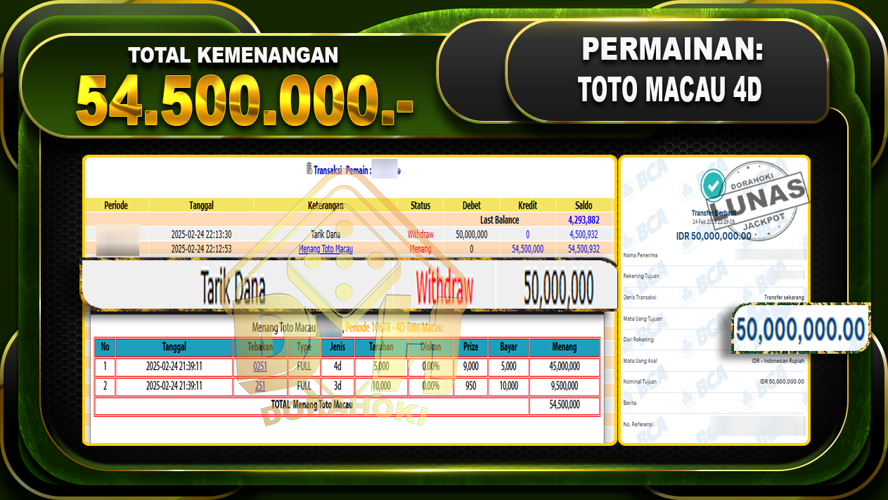 Bukti JP TOGEL TOTO MACAU 4D – ucapkan selamat kepada user id lapexxx atas kemenangan di TOGEL TOTO MACAU 4D dengan total kemenangan Rp.54.500.000,- . Yang pasti nya langsung LUNAS sesuai bukti ya bosku. Dorahoki nih bosku berapapun akan tetap kami bayar lunas ya bosku.