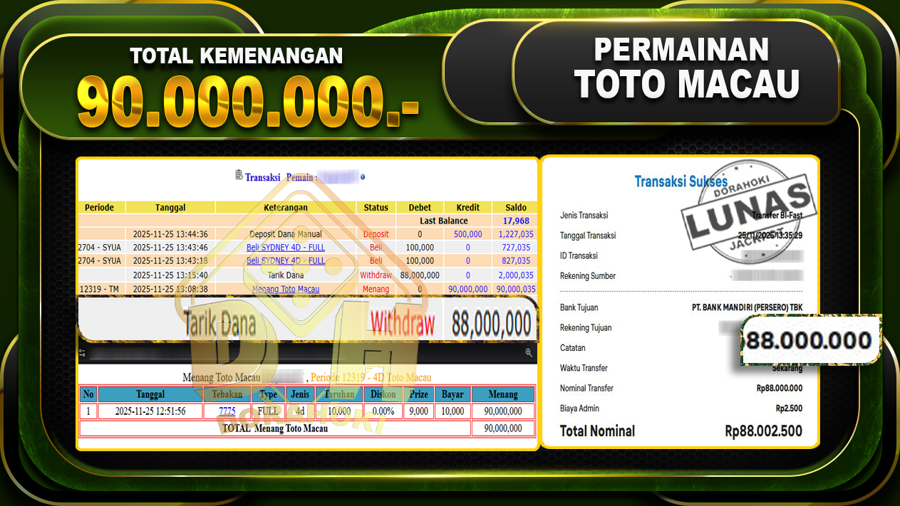 Bukti JP TOGEL TOTO MACAU 4D – ucapkan selamat kepada user id lenxxxxx atas kemenangan di TOGEL TOTO MACAU 4D dengan total kemenangan Rp.90,000,000,- Yang pasti nya langsung LUNAS sesuai bukti ya bosku. Dorahoki nih bosku berapapun akan tetap kami bayar lunas ya bosku