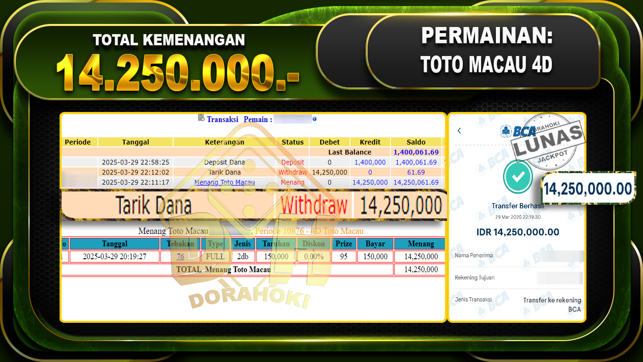 Bukti JP TOGEL TOTO MACAU 4D – ucapkan selamat kepada user id Bukti JP TOGEL TOTO MACAU 4D Dengan total kemenangan Rp12 Juta Rupiah yang tentunya di bayarkan langsung LUNAS & tanpa RIBET ya bosku ^^Tubxxx atas kemenangan di TOGEL TOTO MACAU 4D dengan total kemenangan Rp.14.250.000,- . Yang pasti nya langsung LUNAS sesuai bukti ya bosku. Dorahoki nih bosku berapapun akan tetap kami bayar lunas ya bosku.