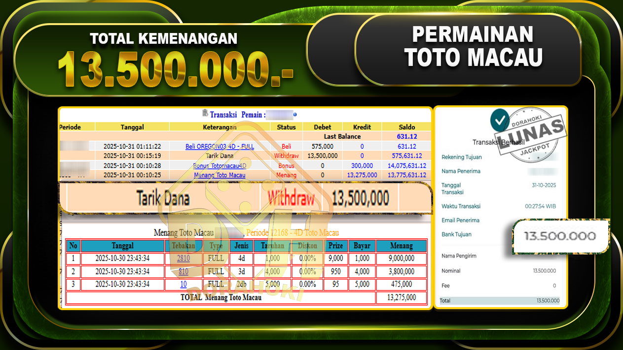 Bukti JP TOGEL TOTO MACAU 4D – ucapkan selamat kepada user id sanxxxx atas kemenangan di TOGEL TOTO MACAU 4D dengan total kemenangan Rp.13,500,000,- Yang pasti nya langsung LUNAS sesuai bukti ya bosku. Dorahoki nih bosku berapapun akan tetap kami bayar lunas ya bosku