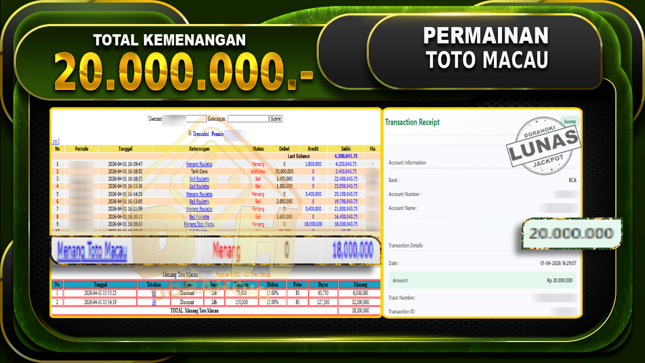 Bukti JP TOGEL TOTO MACAU – Selamat Kepada User ID : Vhixxx atas kemenangan TOGEL TOTO MACAU Dengan Nominal Sebesar Rp. 20.000.000,- . Yang pasti nya langsung LUNAS Sesuai Bukti.