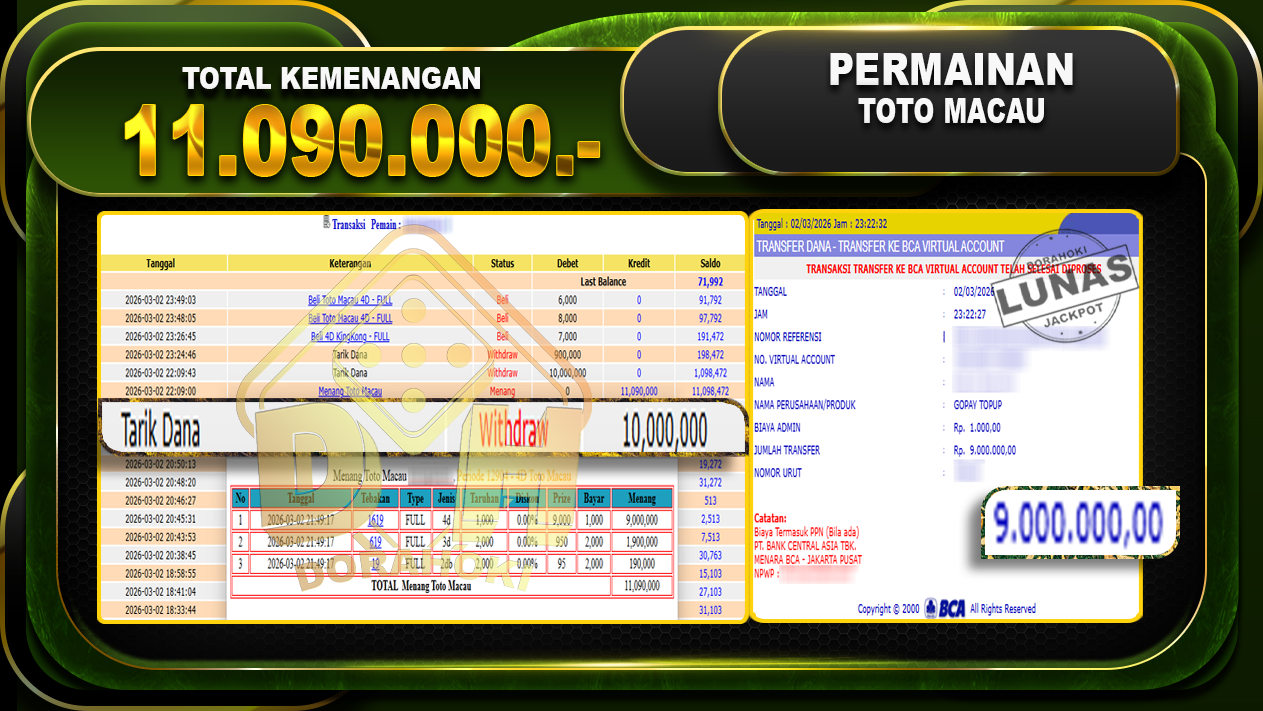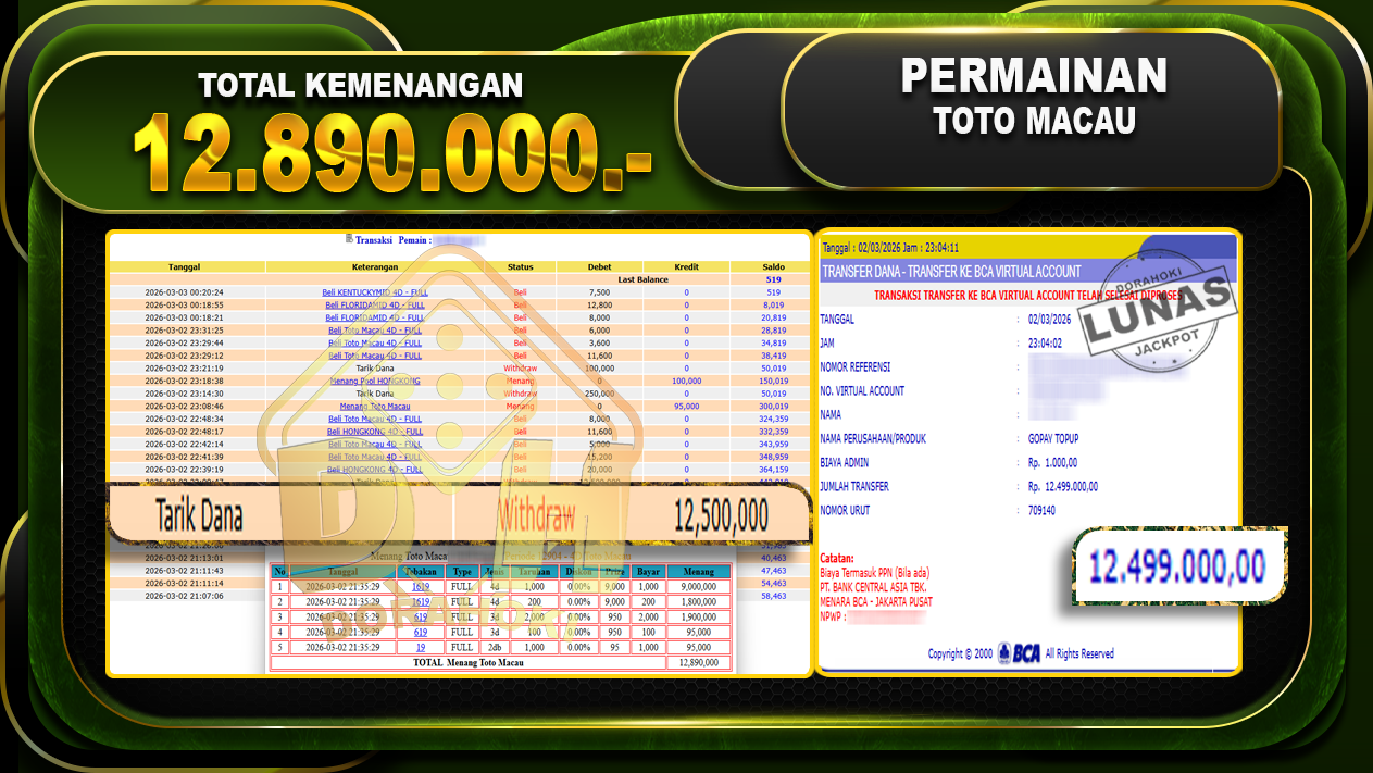 Bukti JP TOGEL TOTO MACAU – Selamat Kepada User ID : Risxxx atas kemenangan TOGEL TOTO MACAU Dengan Nominal Sebesar Rp. 10.000.000,- . Yang pasti nya langsung LUNAS Sesuai Bukti.