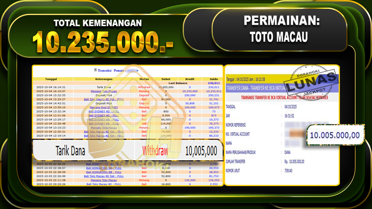 Bukti JP TOGEL TOTO MACAU – ucapkan selamat kepada user id pakxxxx atas kemenangan di TOGEL TOTO MACAU dengan total kemenangan Rp.10,235,000,- Yang pasti nya langsung LUNAS sesuai bukti ya bosku. Dorahoki nih bosku berapapun akan tetap kami bayar lunas ya bosku