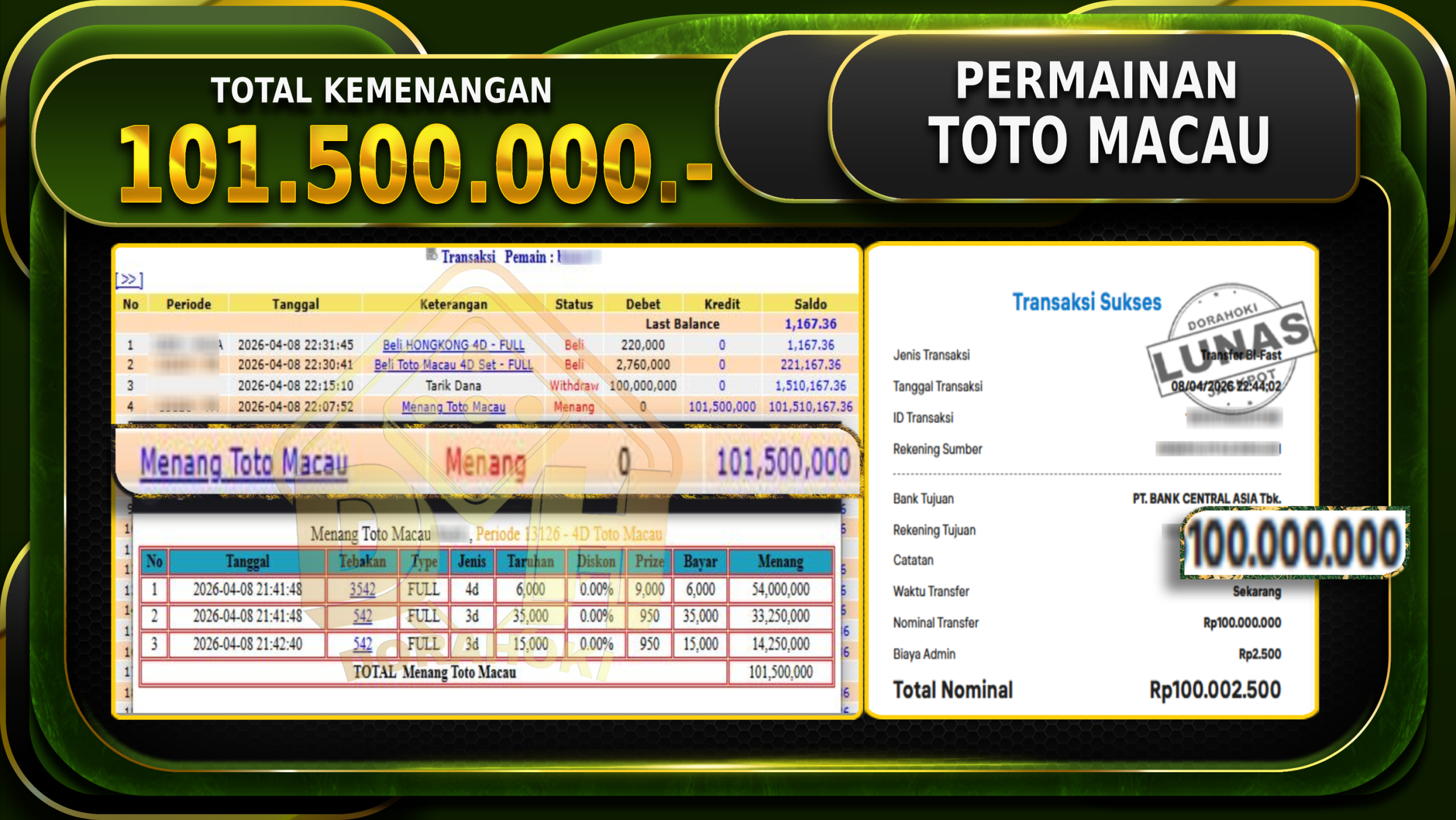 Bukti JP TOGEL Toto Macau – Selamat Kepada User ID : Busxxxx atas kemenangan TOGEL Toto Macau Dengan Nominal Sebesar Rp.101.500.000,- Yang pasti nya langsung LUNAS Sesuai Bukti.