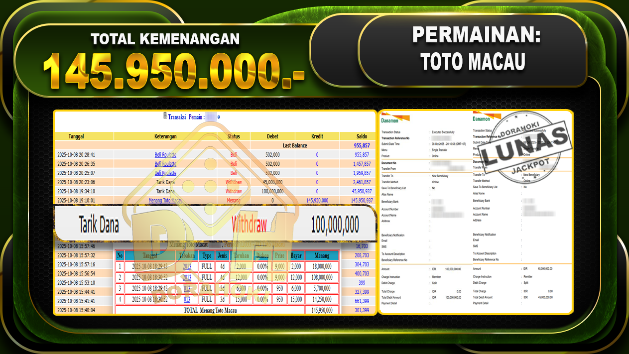 Bukti JP TOGEL TOTO MACAU – ucapkan selamat kepada user id labxxx atas kemenangan di TOGEL TOTO MACAU dengan total kemenangan Rp.145,950,000,- Yang pasti nya langsung LUNAS sesuai bukti ya bosku. Dorahoki nih bosku berapapun akan tetap kami bayar lunas ya bosku