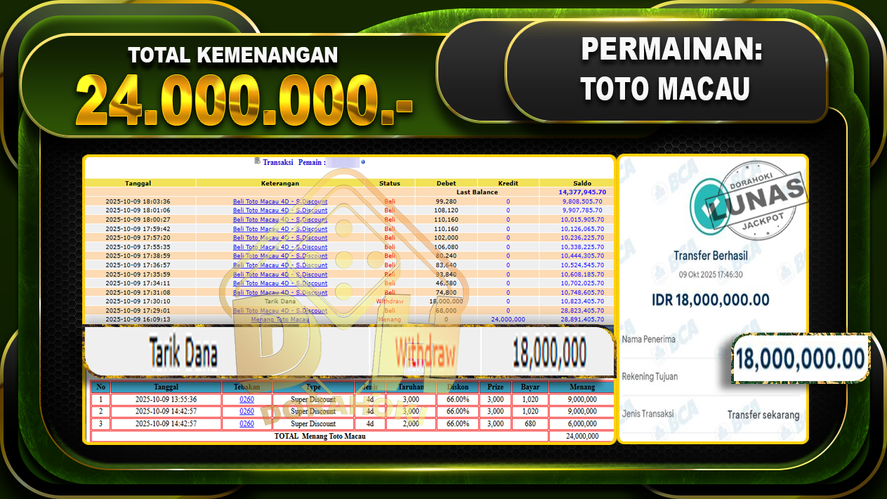 Bukti JP TOGEL TOTO MACAU – ucapkan selamat kepada user id mimxxxxx atas kemenangan di TOGEL TOTO MACAU dengan total kemenangan Rp.24,000,000,- Yang pasti nya langsung LUNAS sesuai bukti ya bosku. Dorahoki nih bosku berapapun akan tetap kami bayar lunas ya bosku