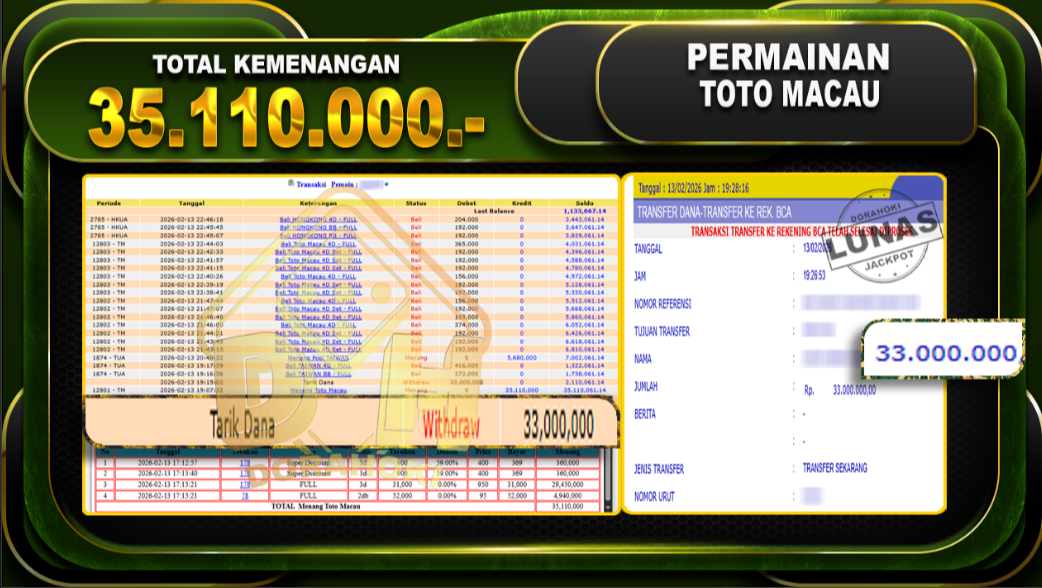 Bukti JP TOGEL TOTO MACAU – Selamat Kepada User ID : Minxxx atas kemenangan TOGEL TOTO MACAU Dengan Nominal Sebesar Rp. 35.110.000,- . Yang pasti nya langsung LUNAS Sesuai Bukti.
