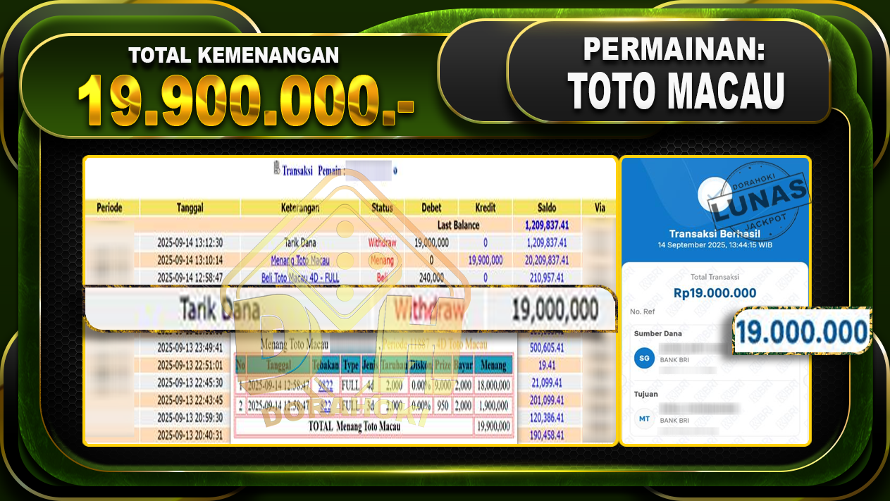 Bukti JP TOGEL TOTO MACAU – ucapkan selamat kepada user id Kpnxxxxxx atas kemenangan di TOGEL TOTO MACAU dengan total kemenangan Rp.19,900,000,- Yang pasti nya langsung LUNAS sesuai bukti ya bosku. Dorahoki nih bosku berapapun akan tetap kami bayar lunas ya bosku