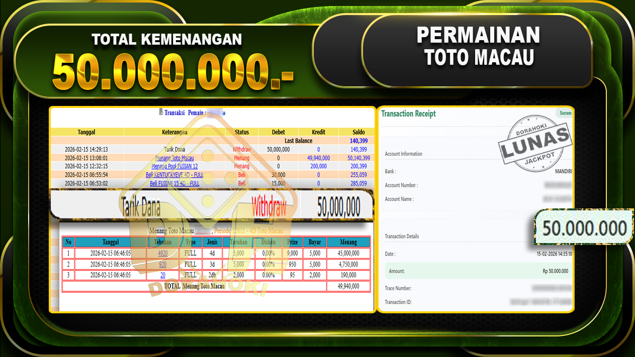 Bukti JP TOGEL TOTO MACAU – Selamat Kepada User ID : Aguxxx atas kemenangan TOGEL TOTO MACAU Dengan Nominal Sebesar Rp. 50,000,000,- . Yang pasti nya langsung LUNAS Sesuai Bukti.
