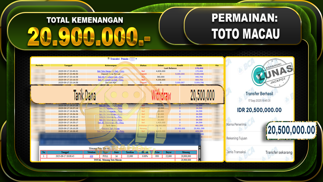 Bukti JP TOGEL TOTO MACAU – ucapkan selamat kepada user id Buxxx atas kemenangan di TOGEL TOTO MACAU dengan total kemenangan Rp.20,900,000,- Yang pasti nya langsung LUNAS sesuai bukti ya bosku. Dorahoki nih bosku berapapun akan tetap kami bayar lunas ya bosku