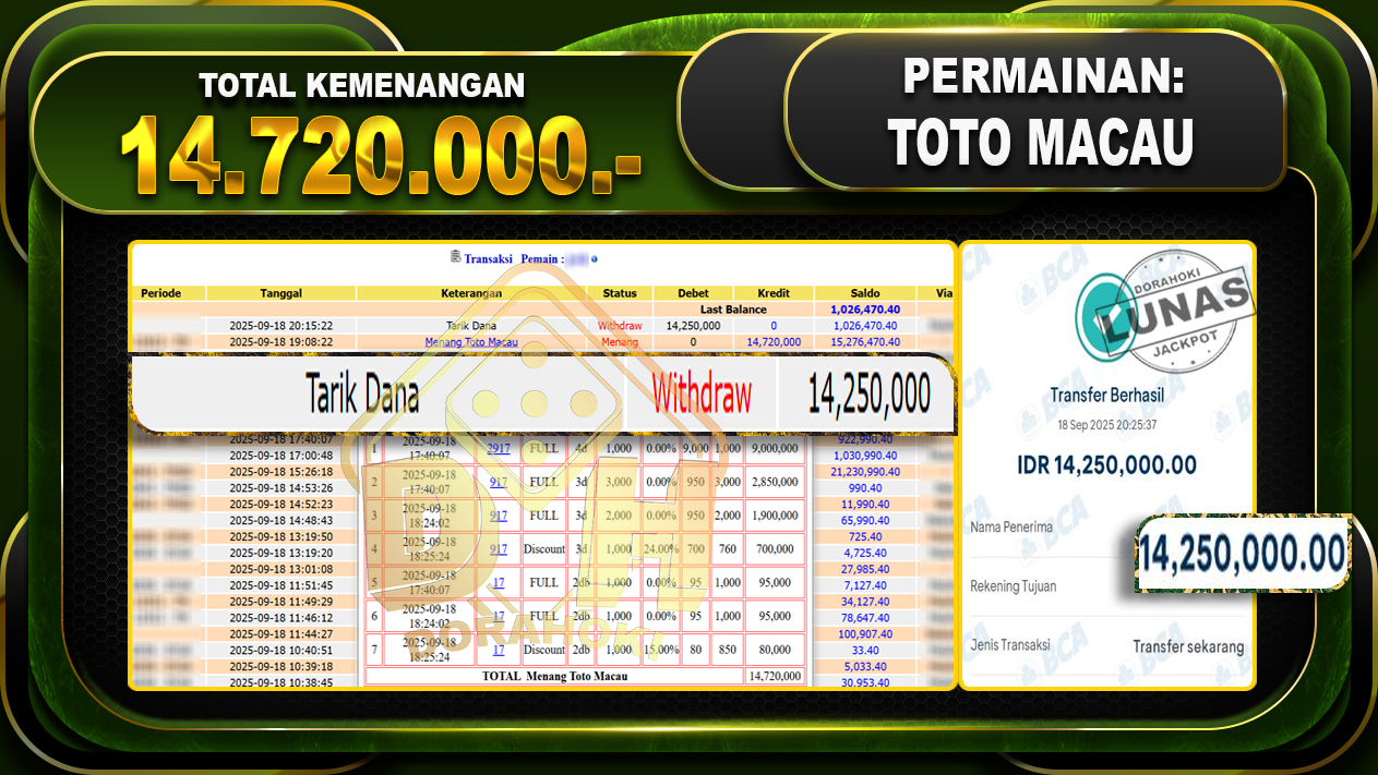 Bukti JP TOGEL TOTO MACAU  – ucapkan selamat kepada user id joxxx atas kemenangan di  TOGEL TOTO MACAU  dengan total kemenangan Rp.14,720,000,- Yang pasti nya langsung LUNAS sesuai bukti ya bosku. Dorahoki nih bosku berapapun akan tetap kami bayar lunas ya bosku