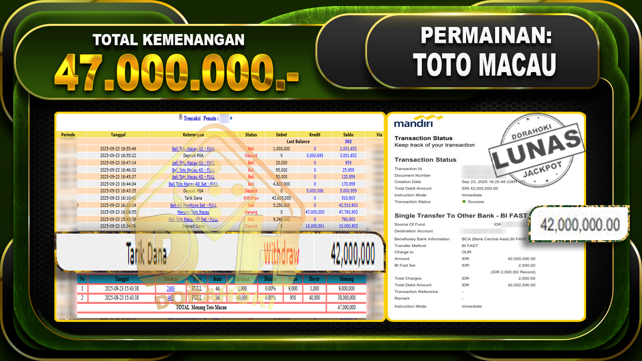 Bukti JP TOGEL TOTO MACAU – ucapkan selamat kepada user id Busxxx atas kemenangan di TOGEL TOTO MACAU dengan total kemenangan Rp.47,000,000,- Yang pasti nya langsung LUNAS sesuai bukti ya bosku. Dorahoki nih bosku berapapun akan tetap kami bayar lunas ya bosku