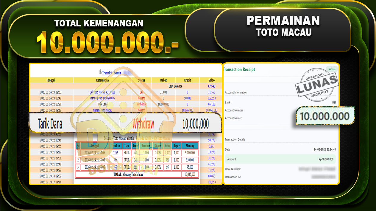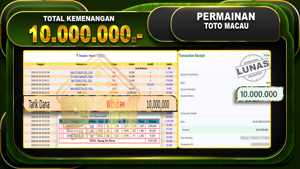 Bukti JP TOGEL TOTO MACAU Yang kami berikan ini sah dan real tanpa di rekayasa bosku dan hanya bertujuan untuk meningkatkan kepercayaan member kami dan memberikan kenyamanan saat bermain jadi bosku tidak perlu khawatir MENANG BERAPAPUN PASTI KAMI BAYAR LUNAS!!
