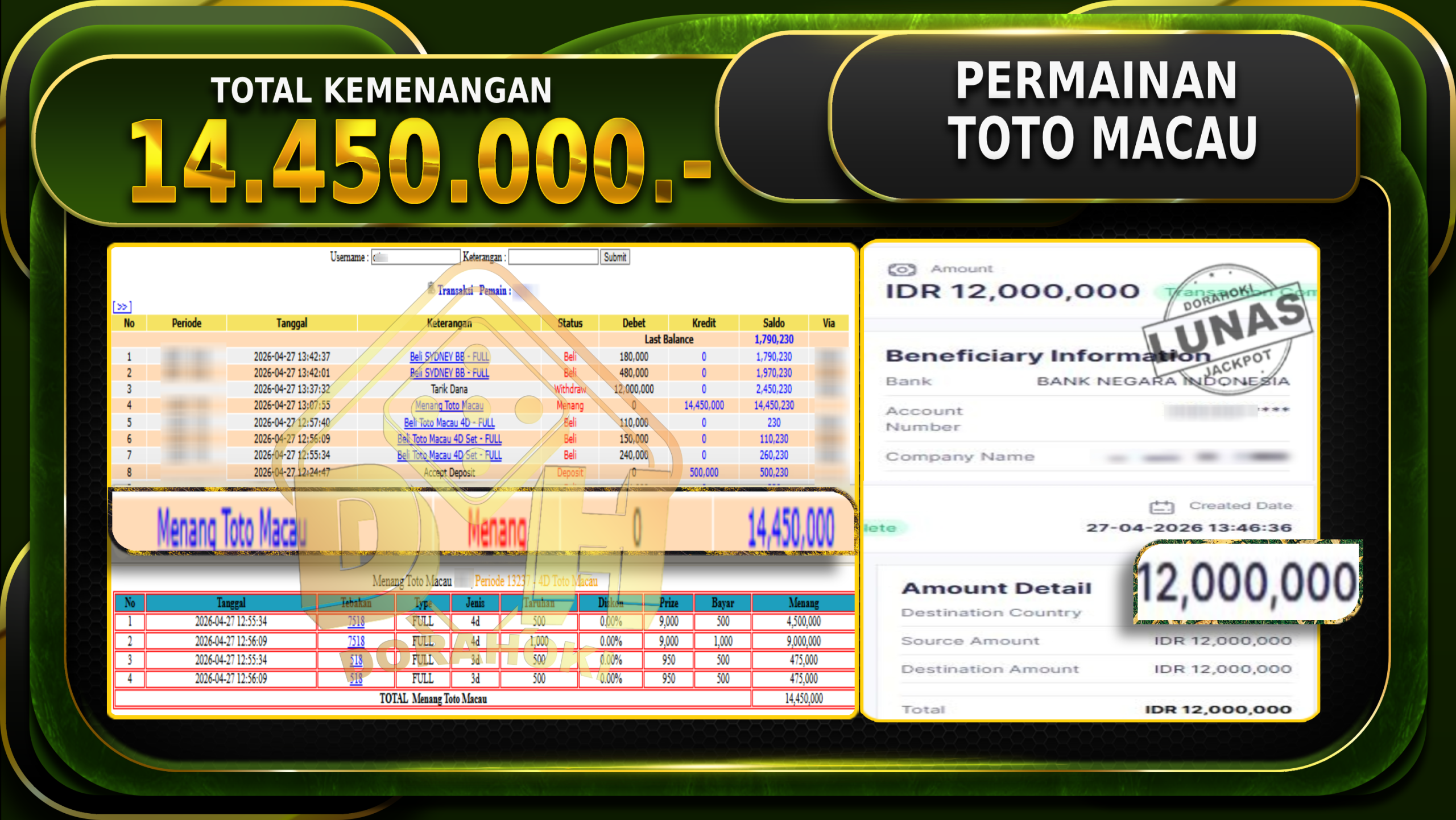 Bukti JP TOGEL Toto Macau – Selamat Kepada User ID : Otixxx atas kemenangan TOGEL Toto Macau Dengan Nominal Sebesar Rp.14.450.000,- Yang pasti nya langsung LUNAS Sesuai Bukti.