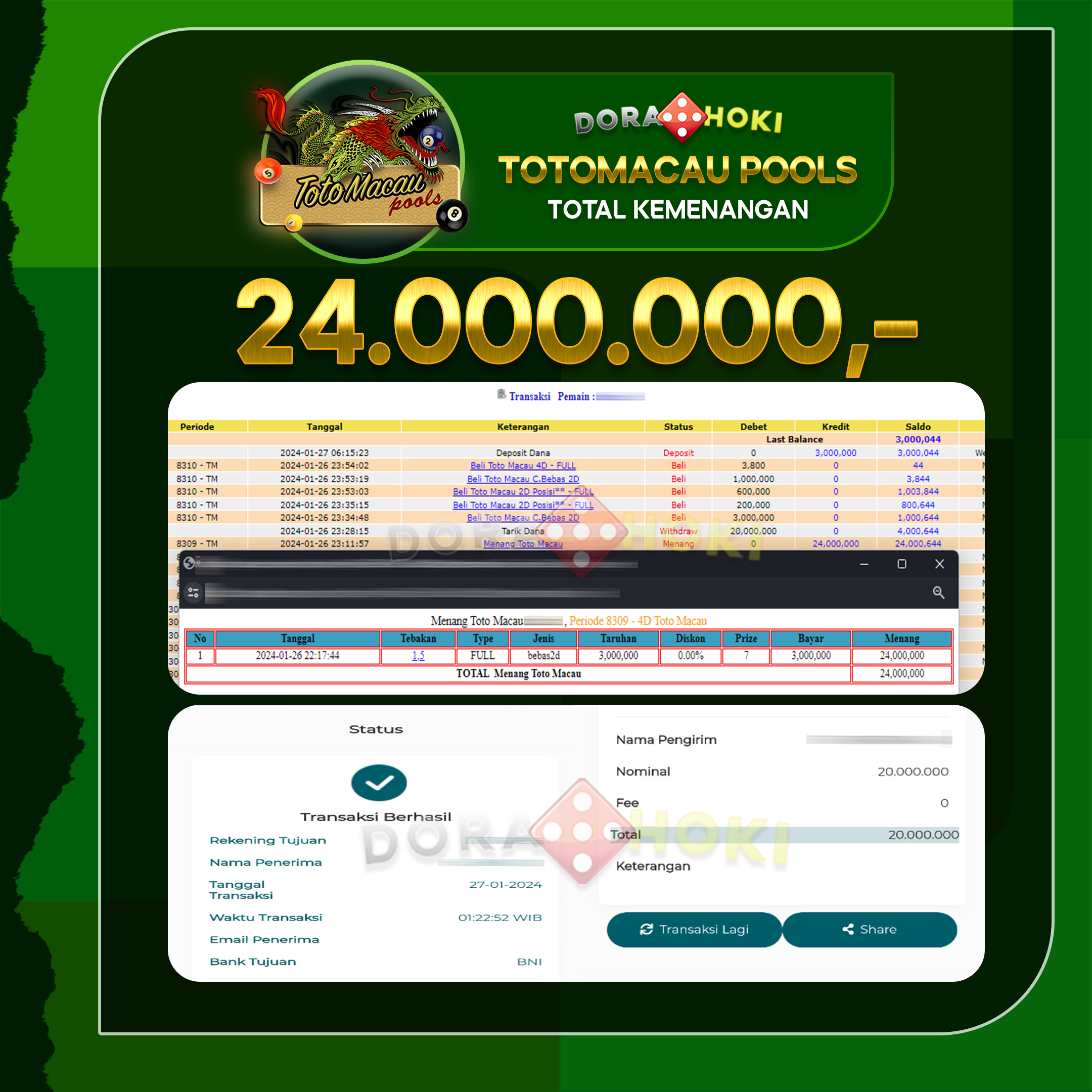 Bukti JP Togel Toto Macau – ucapkan selamat kepada user id Lonxxx atas kemenangan di Togel Toto Macau dengan total kemenangan Rp.20,000,000,- . Yang pasti nya langsung LUNAS sesuai bukti ya bosku. Dorahoki nih bosku berapapun akan tetap kami bayar lunas ya bosku.