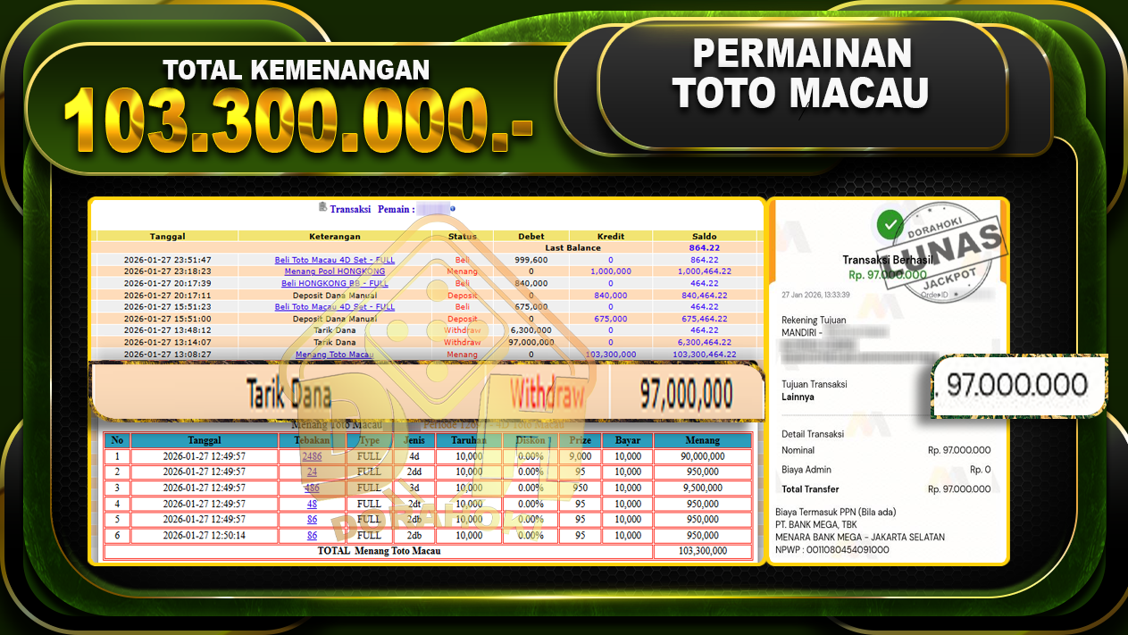 Bukti JP TOGEL TOTO MACAU – Selamat Kepada User ID : yatxxx atas kemenangan TOGEL TOTO MACAU Dengan Nominal Sebesar Rp 103.300.000,- . Yang pasti nya langsung LUNAS Sesuai Bukti.