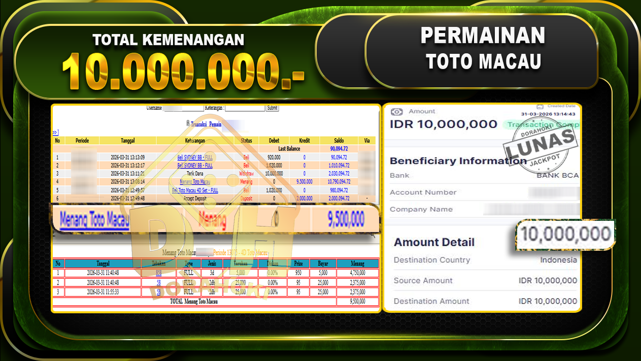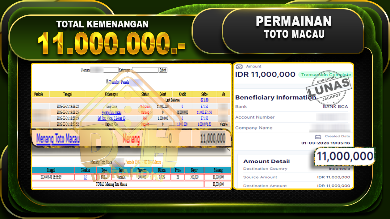 Bukti JP TOGEL TOTO MACAU – Selamat Kepada User ID : Sagxxx atas kemenangan TOGEL TOTO MACAU Dengan Nominal Sebesar Rp. 11.000.000,- . Yang pasti nya langsung LUNAS Sesuai Bukti.