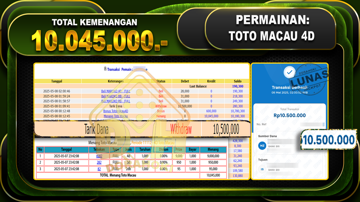 Bukti JP TOGEL TOTOMACAU 4D – ucapkan selamat kepada user id Danxxx atas kemenangan di TOGEL TOTOMACAU 4D dengan total kemenangan Rp.10.450.000,- . Yang pasti nya langsung LUNAS sesuai bukti ya bosku. Dorahoki nih bosku berapapun akan tetap kami bayar lunas ya bosku.