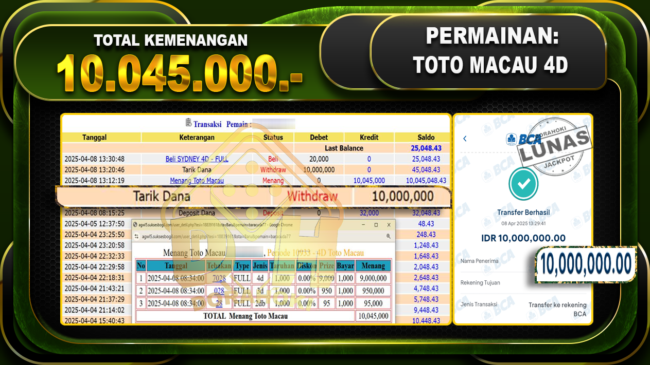 Bukti JP TOGEL TOTOMACAU 4D – ucapkan selamat kepada user id Barxxx atas kemenangan di TOGEL TOTOMACAU 4D dengan total kemenangan Rp.10.045.000,- . Yang pasti nya langsung LUNAS sesuai bukti ya bosku. Dorahoki nih bosku berapapun akan tetap kami bayar lunas ya bosku.