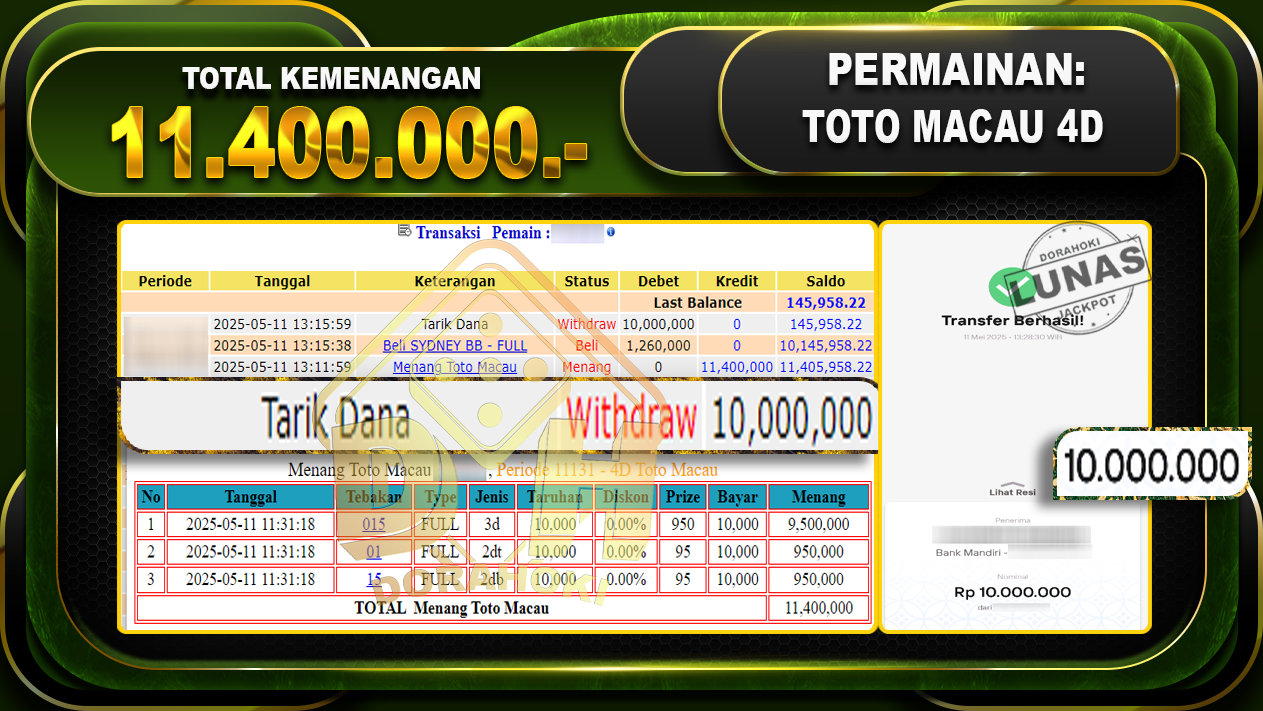 Bukti JP TOGEL TOTOMACAU 4D – ucapkan selamat kepada user id Harxxx atas kemenangan di TOGEL TOTOMACAU 4D dengan total kemenangan Rp.11.400.000,- . Yang pasti nya langsung LUNAS sesuai bukti ya bosku. Dorahoki nih bosku berapapun akan tetap kami bayar lunas ya bosku.