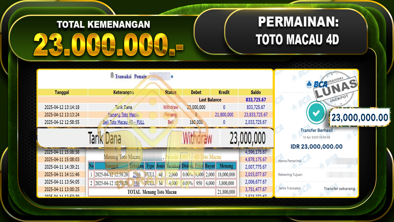 Bukti JP TOGEL TOTOMACAU 4D – ucapkan selamat kepada user id Abaxxx atas kemenangan di TOGEL TOTOMACAU 4D dengan total kemenangan Rp.23.000.000,- . Yang pasti nya langsung LUNAS sesuai bukti ya bosku. Dorahoki nih bosku berapapun akan tetap kami bayar lunas ya bosku.