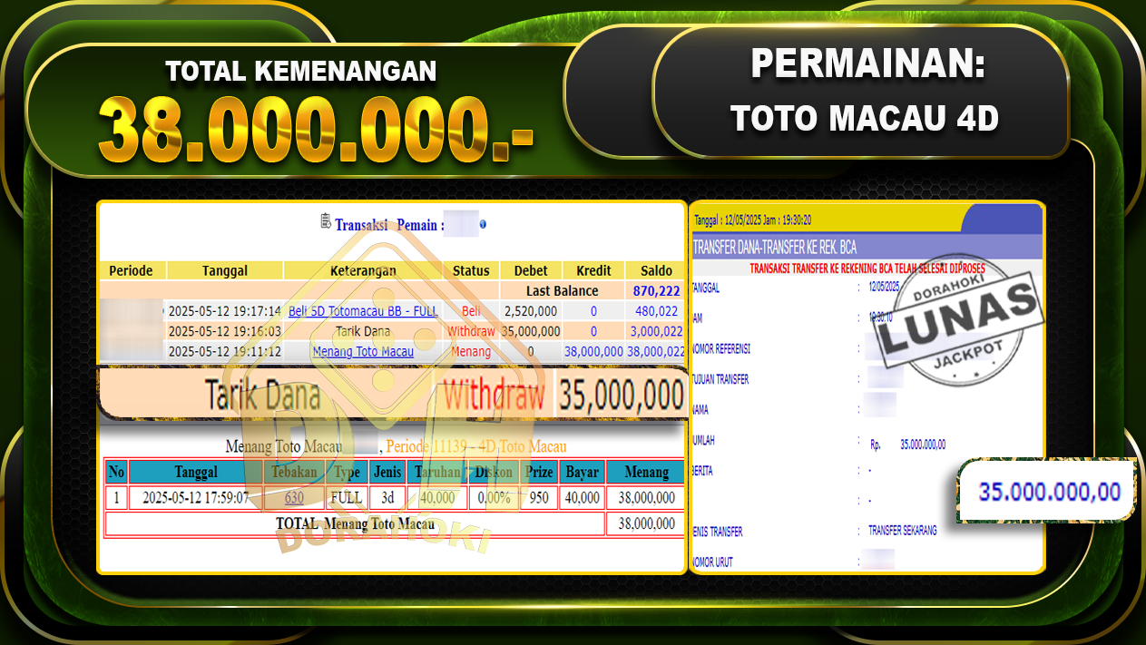 Bukti JP TOGEL TOTOMACAU 4D – ucapkan selamat kepada user id Busxxx atas kemenangan di TOGEL TOTOMACAU 4D dengan total kemenangan Rp.38.000.000,- . Yang pasti nya langsung LUNAS sesuai bukti ya bosku. Dorahoki nih bosku berapapun akan tetap kami bayar lunas ya bosku.
