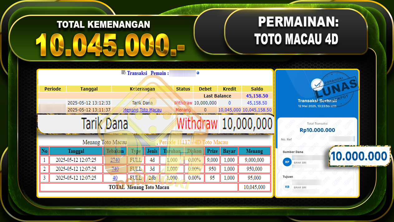 Bukti JP TOGEL TOTOMACAU 4D – ucapkan selamat kepada user id Modxxx atas kemenangan di TOGEL TOTOMACAU 4D dengan total kemenangan Rp.10.045.000,- . Yang pasti nya langsung LUNAS sesuai bukti ya bosku. Dorahoki nih bosku berapapun akan tetap kami bayar lunas ya bosku.